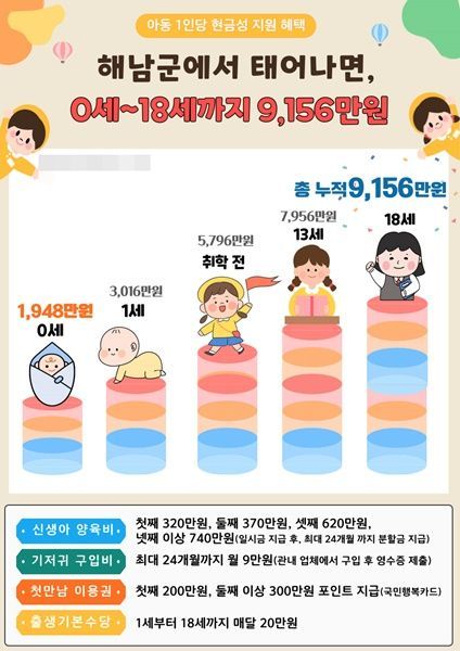 전남 해남군(군수 명현관)에서 태어난 아이는 성인이 되기 전 18세까지 총 9,156만원의 지원을 받는다.