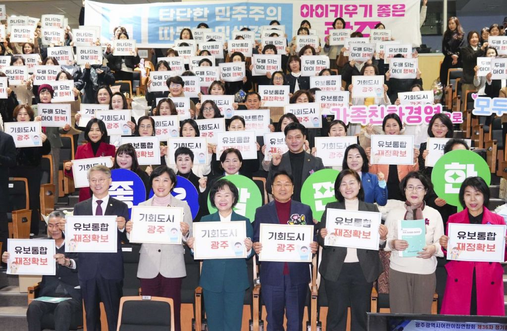 강기정 광주시장이 7일 오전 동구 전일빌딩245에서 열린 ‘광주시 어린이집연합회 정기총회’에 참석해 신수정 광주시의회 의장, 박신애 회장 등 참석자들과 기념 촬영을 하고 있다. 광주시 제공