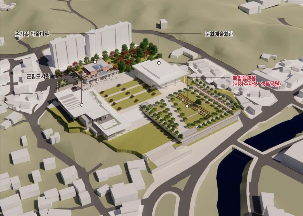 연면적 4,970㎡ 규모로 지하 1층에는 180면의 공영주차장과 상부 광장 형식으로 군민의 다양한 활동과 행사를 지원할 수 있는 도심 속 대표 자연친화 공간으로 조성될 예정이다.