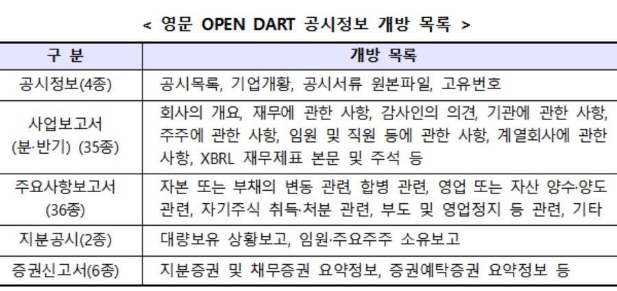 이와 함께 금감원은 공시정보 4종, 사업보고서 35종, 주요 사항보고서 36종, 지분공시 2종, 증권신고서 6종 등 총 85종의 영문공시 정보를 데이터 형태로 제공하는 플랫폼도 새롭게 구축했다. 오는 10일부터 'Open DART' 플랫폼이 열리면 외국인 투자자들도 웹 화면에서 원하는 항목을 엑셀 파일로 직접 추출해 활용할 수 있게 된다. 특히 상장사 전체 국제표준 전산언어(XBRL) 주석을 빅데이터로 제공하는 등 정보 수집 방식도 대폭 개선했다.