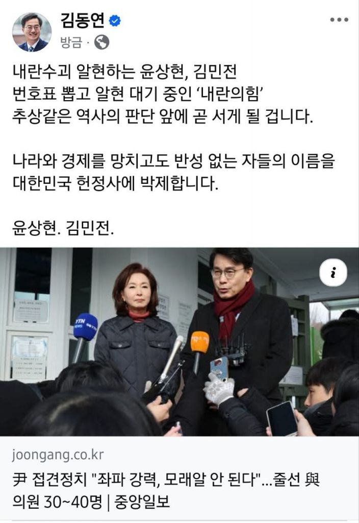 김동연 지사는 8일 자신의 사회관계망서비스(SNS)에 올린 글에서 "내란수괴 알현하는 윤상현, 김민전. 번호표 뽑고 알현 대기 중인 ‘내란의 힘’"이라며 "추상같은 역사의 판단 앞에 곧 서게 될 것"이라고 주장했다.