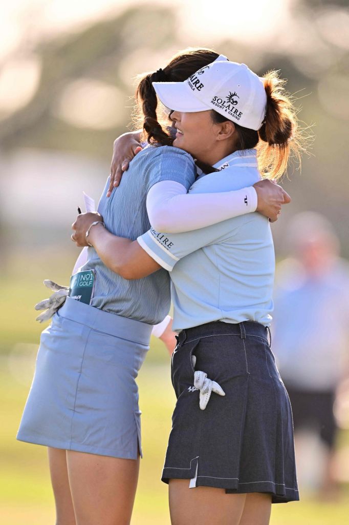 고진영(오른쪽)과 노예림이 파운더스컵 3라운드를 마친 뒤 포옹하고 있다. 브레이든턴=AFP·연합뉴스