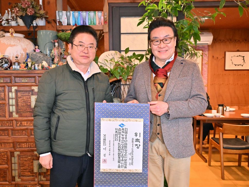APEC 문화총감독을 맡은 홍익대 이도훈 교수(오른쪽)가 위촉장을 들고 이철우 경북지사와 기념촬영을 하고 있다.