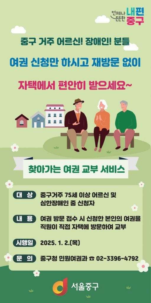 서울 중구의 75세 이상 어르신과 중증 장애인들은 올해부터 여권 발급을 위해 한 번만 구청을 방문하면 된다. 통상 여권을 발급받으려면 신청과 수령을 위해 최소 두 번은 구청을 방문해야 한다.