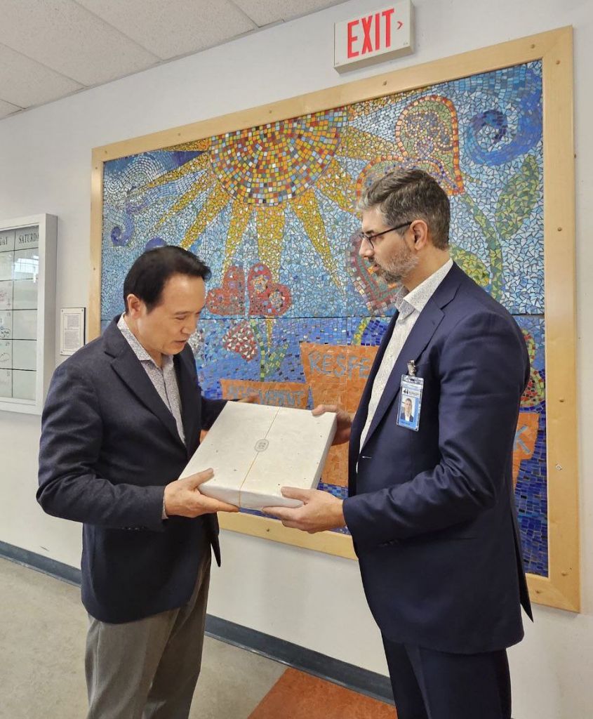 임태희 경기도교육감(왼쪽)이 7일(현지시간) 카림 하클라프 버나비 교육장에게 선물을 전달하고 있다. 경기도교육청 제공