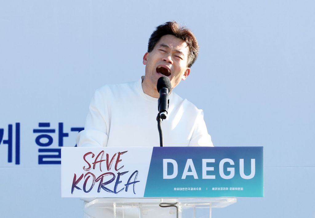 한국사 강사 전한길 씨가 8일 오후 동대구역 광장에서 열린 세이브코리아 주최 국가비상기도회에서 발언하고 있다. 연합뉴스