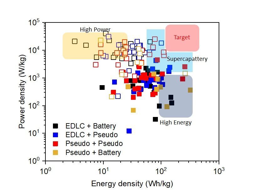 기존의 슈퍼커패시터(supercapacitor)는 높은 출력 밀도를 제공하는 반면, 배터리는 높은 에너지 밀도를 갖고 있다.