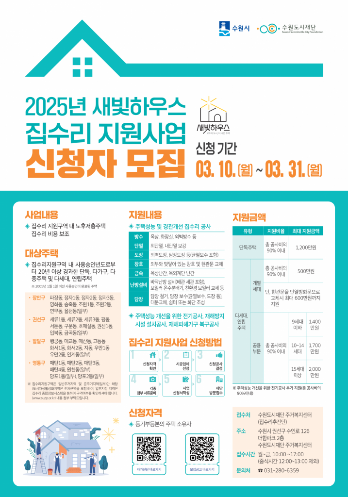 새빛하우스 사업 신청을 원하는 주택 소유자는 수원시 집수리통합플랫폼(www.suzip.or.kr)에 들어가 신청 자격을 확인한 뒤 수원시에 등록된 집수리 지원업체(92곳)와 함께 신청 서류를 수원도시재단주거복지센터(권선구 수인로 더함파크 2층)에 제출하면 된다.