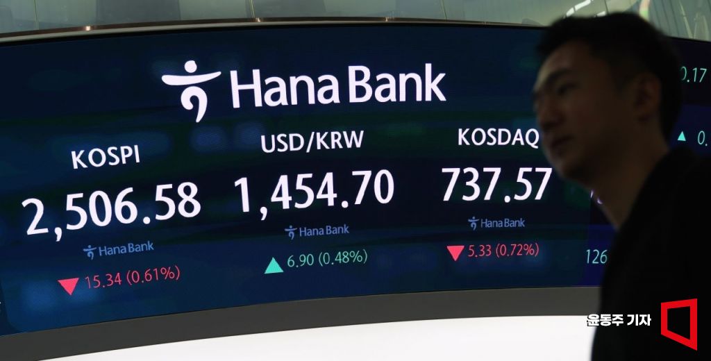 코스피가 10일 미국 발 '관세전쟁' 우려 속에 하락세로 장을 시작한 10일 서울 중구 하나은행 딜링룸 현황판에 주가 지수와 환율이 표시되고 있다.