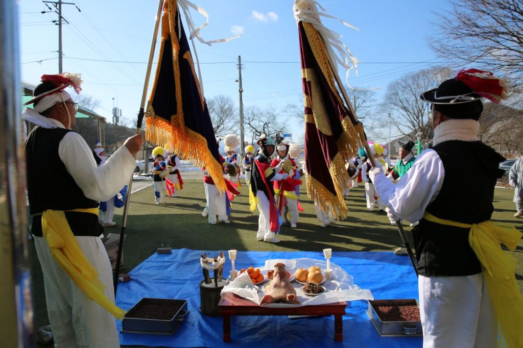 한천 농악의 전체 공연은 9시간이 넘게 소요되지만 이날 공연은 5시간 동안 마을굿의 원형을 복원하는 방식으로 진행됐다. 사진은 한천 농악 공연 가운데 기굿 장면.
