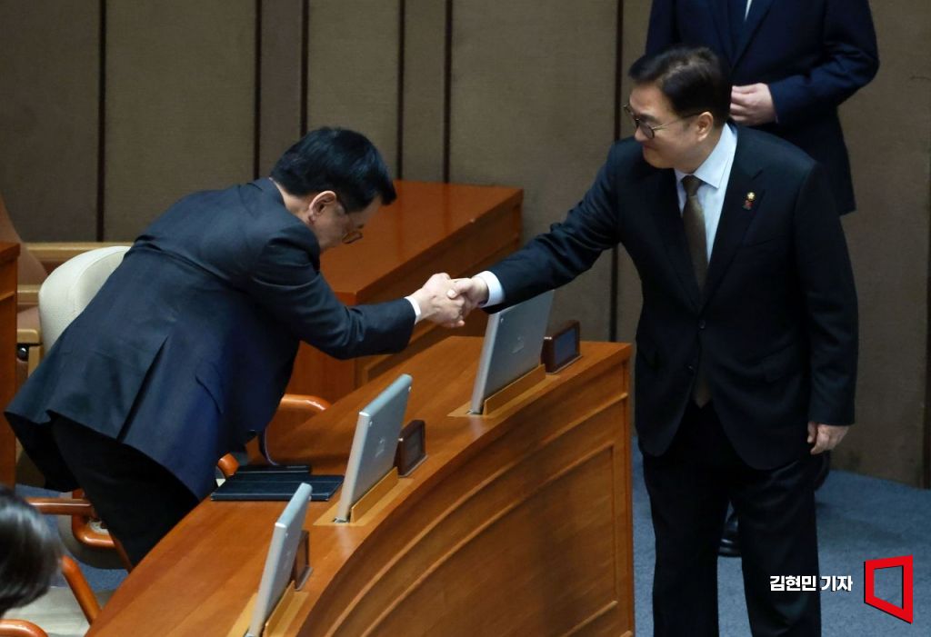 우원식 국회의장과 최상목 대통령권한대행 부총리 겸 기획재정부 장관이 10일 국회에서 열린 본회의에서 인사하고 있다.