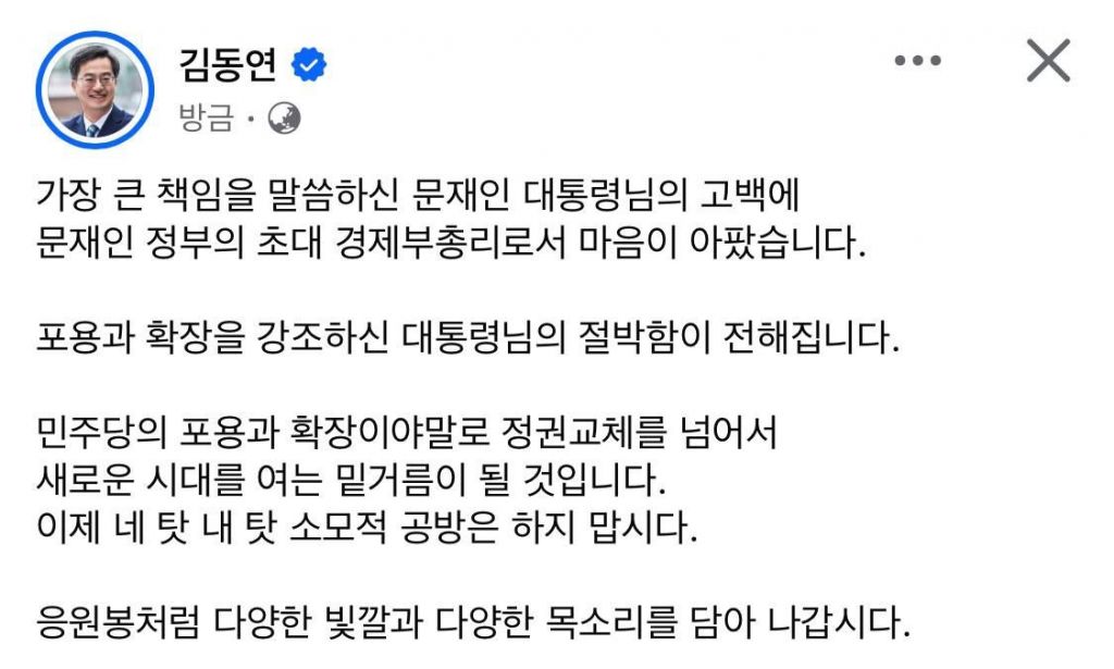 김동연 지사는 10일 자신의 사회관계망서비스(SNS)에 올린 글에서 "가장 큰 책임을 말씀하신 문재인 대통령님의 고백에 문재인 정부의 초대 경제부총리로서 마음이 아팠다"며 "포용과 확장을 강조하신 대통령님의 절박함이 전해진다"고 밝혔다.