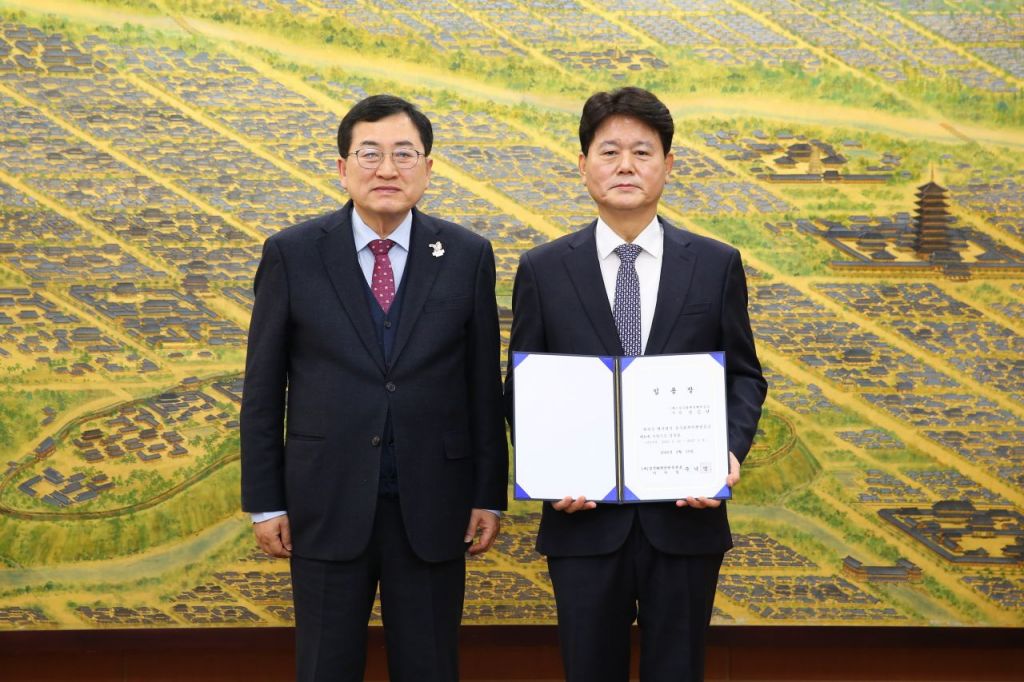 주낙영 경주시장이 10일 시청에서 신임 HICO 사장에 전시컨벤션 분야 전문가인 윤승현(오른쪽) 전 한남대 교수에게 임명장을 수여한 후 기념 촬영을 하고 있다.