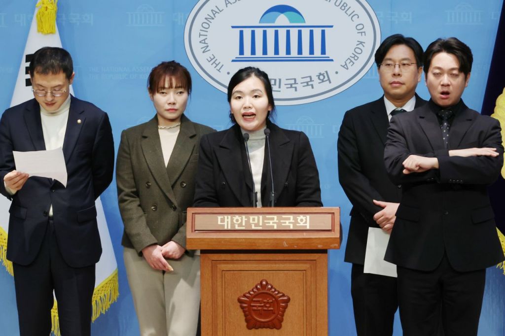국민의힘 친한계, 소장파 모임인 '언더73(1973년생 이하 정치인)'의 김상욱(왼쪽부터)·김예지 의원과 정혜림 전 부대변인, 박상수 인천서구갑 당협위원장이 10일 서울 여의도 국회 소통관에서 기자회견을 하고 있다. 연합뉴스