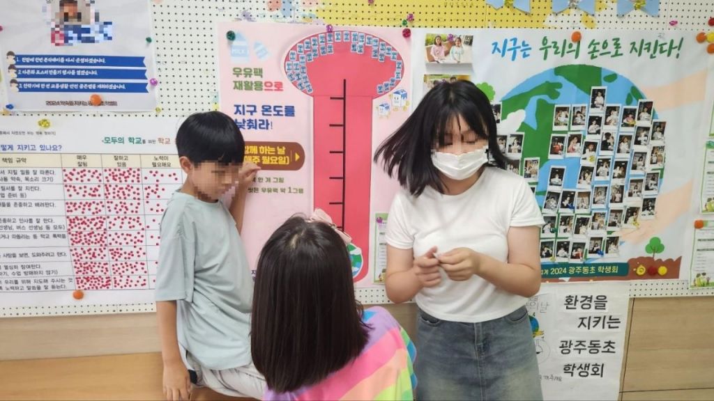 지난해 녹색생활실천활성화 사업 운영학교인 광주동초등학교의 지구온도알림 게시판 활동 모습. 광주교육청 제공