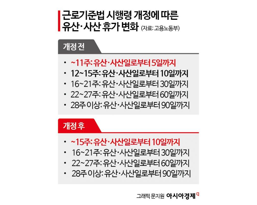정부는 근로기준법 시행령 개정을 통해 임시 초기에 받을 수 있는 유산, 사산 휴가를 5일에서 10일로 늘린다. 기존에는 임신 11주 이내에 유산이나 사산을 하면 해당 날짜로부터 5일간 휴가를 받았다. 12주부터 15주까지여야 10일 휴가가 가능했다. 앞으로는 11주 이내더라도 10일 휴가를 받을 수 있다.