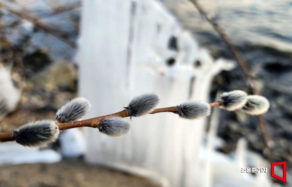 길게 이어지던 입춘한파가 물러가고 서울 낮기온이 영상 6도까지 오를것으로 예보된 11일 서울 뚝섬 한강공원에 활짝 핀 버들개지 뒤로 고드름이 녹고 있다.