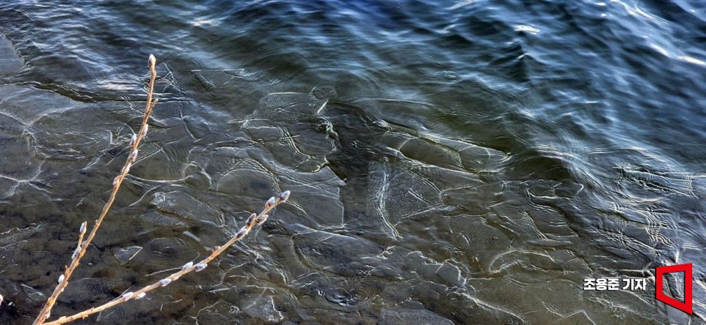 길게 이어지던 입춘한파가 물러가고 서울 낮기온이 영상 6도까지 오를것으로 예보된 11일 서울 뚝섬 한강공원에 활짝 핀 버들개지 뒤로 결빙 된 한강이 녹고 있다.