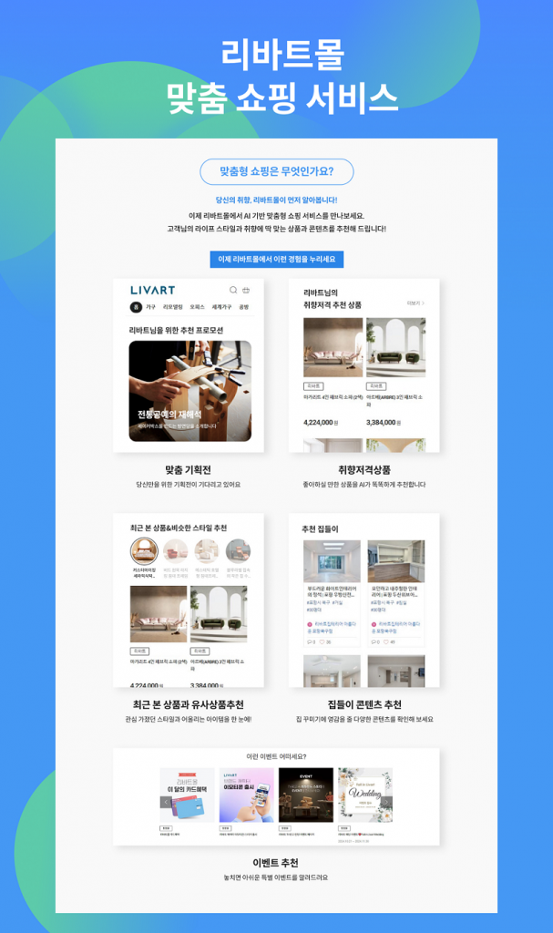 고객이 몰에서 관심 공간, 선호 인테리어 스타일, 선호 가구 색상, 가족 구성, 공간 크기 등 다섯 가지 문항에 답하면 AI가 해당 답변과 고객의 리바트몰에서의 구매 및 검색 이력을 분석한 후, 사용자 취향에 맞을 것으로 예상되는 제품이나 프로모션을 제안한다.