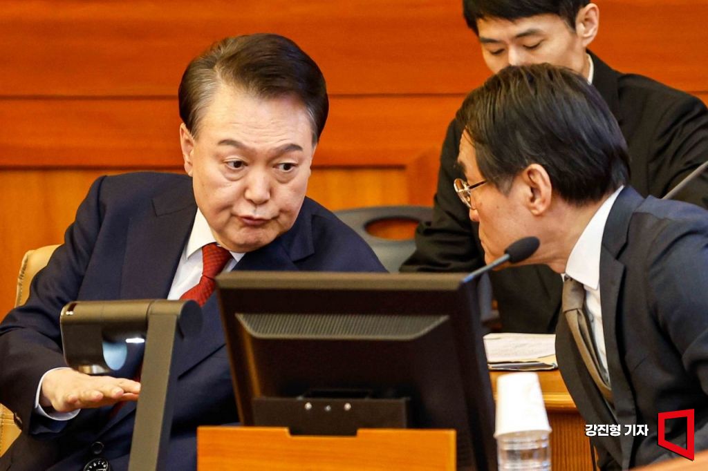 윤석열 대통령이 11일 서울 종로구 헌법재판소에서 열린 '윤석열 대통령 탄핵심판 7차 변론'에 출석해 배보윤 변호사와 의견을 나누고 있다.