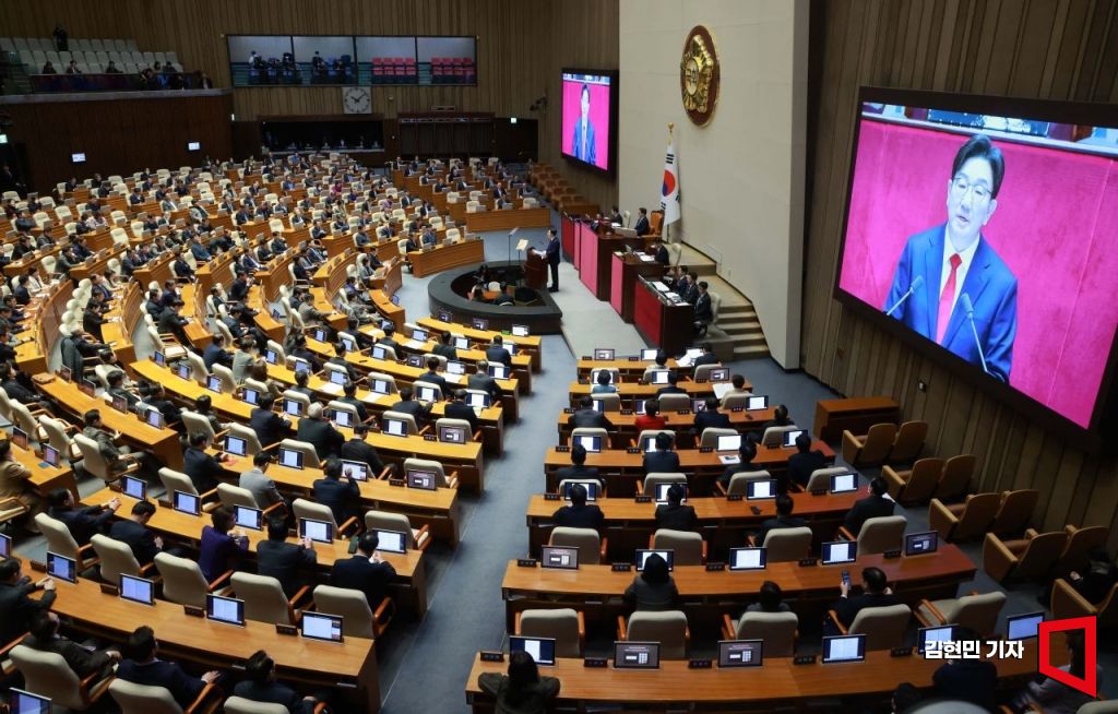 권성동 국민의힘 원내대표가 11일 국회에서 열린 본회의에서 교섭단체 대표연설을 하고 있다.