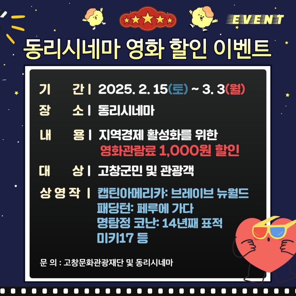 전북 고창문화관광재단이 오는 15일부터 내달 3일까지 고창동리시네마에서 7,000원이던 영화관람료를 1,000원 할인 이벤트를 진행한다.