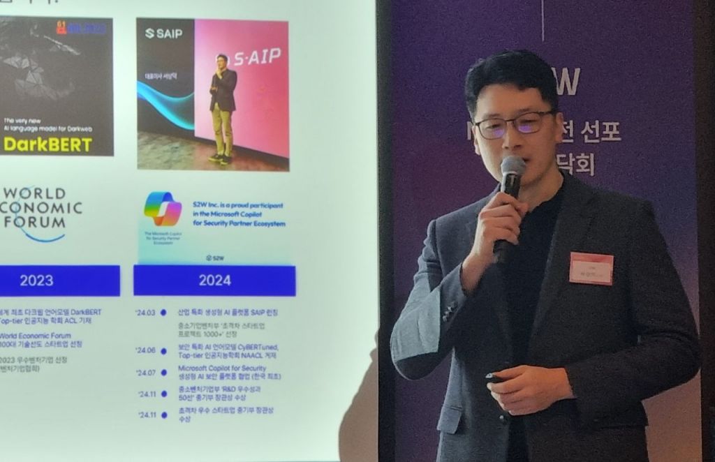 서상덕 S2W 대표가 11일 오전 서울 중구 더 플라자 호텔 서울 4층에서 열린 'S2W NEXT 비전 선포 기자간담회'에서 사업 성과와 비전 등을 발표하고 있다. 최호경 기자