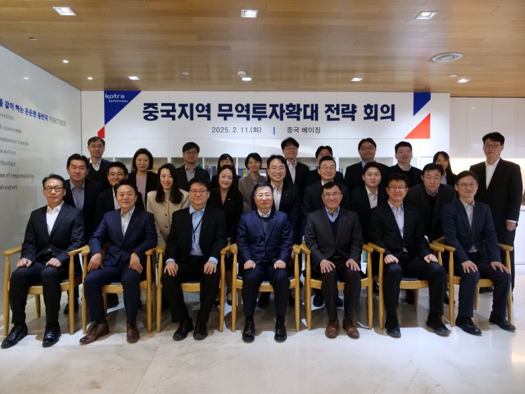 강경성 대한무역투자진흥공사(코트라·KOTRA) 사장 등이 11일 중국 베이징무역관에서 열린 중국지역 무역투자확대 전략회의에서 기념촬영을 하고 있다. 코트라 제공
