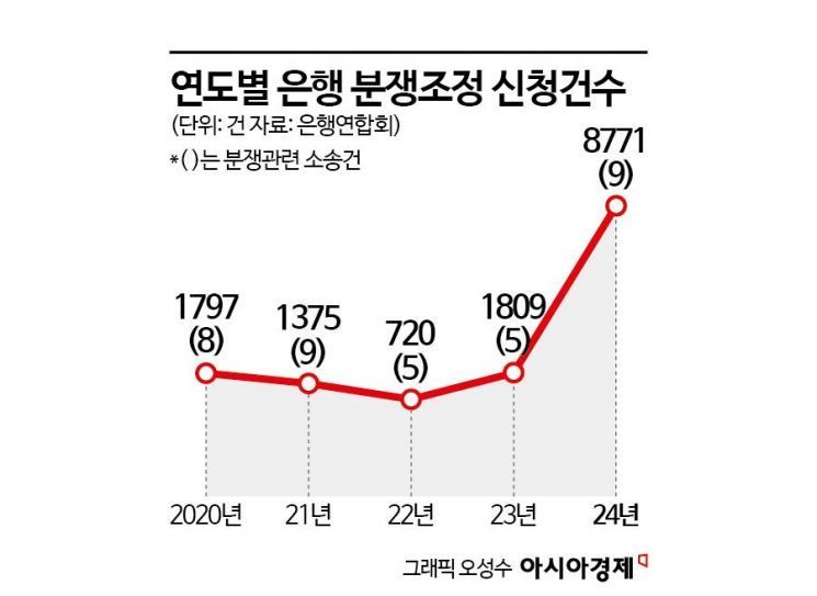 12일 은행연합회에 따르면 지난해 금감원에 제기된 은행 분쟁조정 신청 건수는 8771건으로 역대 최고치를 기록했다. 2023년 1809건 대비 385% 급증한 수치다. 피해자 한 명이 다수의 금융회사에 여러 건을 중복으로 신청한 사례를 제외해도 5578건으로 전년 1332건에 비해 319% 늘었다.