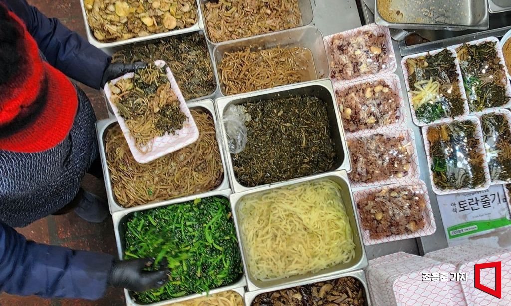 정월대보름을 하루 앞둔 11일 서울 용산구 용문시장의 한 가게에서 상인이 오곡밥과 대보름나물을 용기에 담아 진열하고 있다.