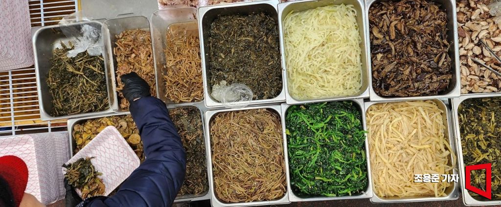 정월대보름을 하루 앞둔 11일 서울 용산구 용문시장의 한 가게에서 상인이 오곡밥과 대보름나물을 용기에 담아 진열하고 있다.