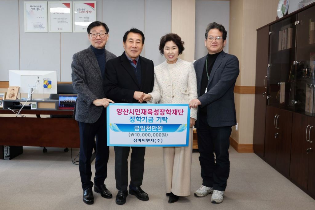 경남 양산시인재육성장학재단은 11일 삼마이엔지에서 지역 인재 육성을 위한 장학금 1000만원을 양산시인재육성장학재단에 기탁했다고 전했다.