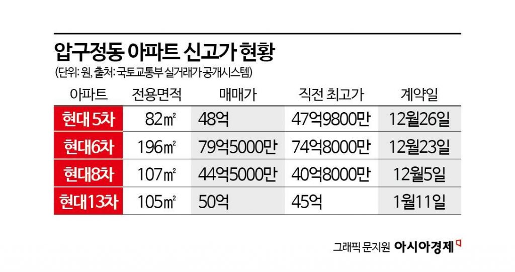 압구정 현대 5차는 지난해 12월 전용면적 82㎡(13층)가 48억원에 손바뀜했다. 현대 5차는 지난해 8월 44억8000만원에 거래된 뒤 같은 해 10월 47억9800만원에 팔리며 신고가를 다시 쓴 바 있다. 지난해 한 해 동안 신고가를 총 3번 경신했다. 현대 5차 동일면적 호가는 현재 55억원까지 치솟았다. 압구정 A공인 관계자는 "하루에도 몇 번씩 매물 없냐는 문의 전화가 온다. 집주인들은 가격을 올려받으려고 한다"고 말했다.