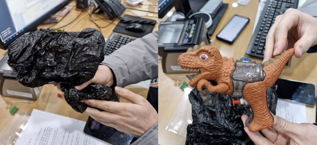 10일 오전 부산 기장군 일광읍 한 은행에서 30대 남성이 검은 비닐로 감싼 장난감 공룡 물총으로 돈을 내놓으라고 협박하다 고객과 은행 직원에게 2분만에 검거됐다고 부산 기장경찰서가 밝혔다. 연합뉴스