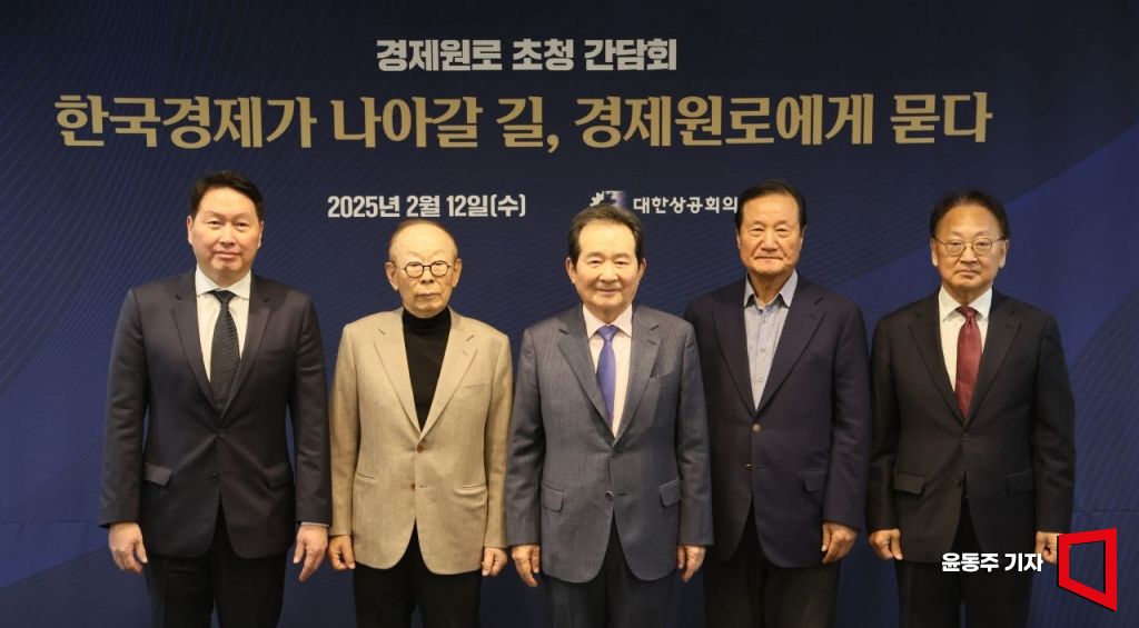 최태원 대한상공회의소 회장이 12일 서울 중구 대한상의에서 열린 경제 원로들과 간담회에 참석해 기념사진을 찍고 있다. 이날 간담회는 한국 경제가 나아갈 방향에 대해 경제 원로에게 조언을 구하고자 마련되었다. 간담회에는 정세균 전 국회의장, 이헌재 전 기획재정부 장관, 윤증현 전 기획재정부 장관, 유일호 전 기획재정부 장관이 참석했다. 2025.02.12 윤동주 기자