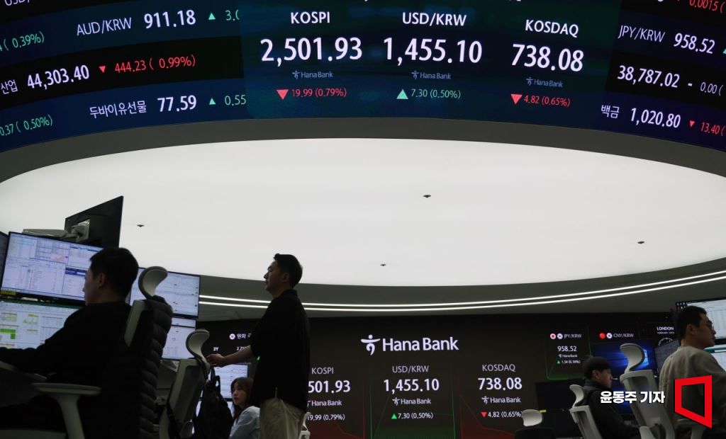 코스피가 10일 미국 발 '관세전쟁' 우려 속에 하락세로 장을 시작한 10일 서울 중구 하나은행 딜링룸 현황판에 주가 지수와 환율이 표시되고 있다. 2025.02.10 윤동주 기자