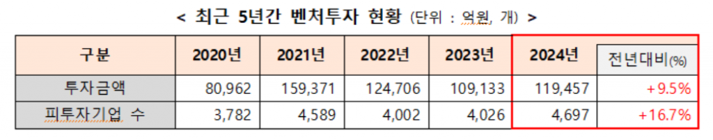 지난해 벤처투자 규모는 총 11조9000억원으로 집계됐다. 전년 대비 9.5% 증가한 수치로, 2021년부터 이어진 감소 추세에서 벗어나 3년 만에 반등에 성공했다. 이 기간 글로벌 벤처투자 규모(480조원)가 전년 대비 거의 변동이 없었던 것을 고려하면 글로벌 시장 대비 회복세가 뚜렷하다는 것이 중기부 해석이다.