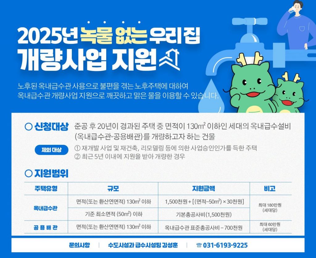 경기도 용인시는 노후 수도관을 개량하기 위한 '녹물 없는 우리 집 수도관 개량 사업' 대상 가구를 모집한다.