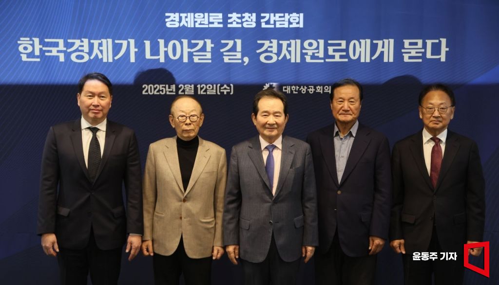 최태원 대한상공회의소 회장이 12일 서울 중구 대한상의에서 열린 경제 원로들과 간담회에 참석해 기념사진을 찍고 있다. 이날 간담회는 한국 경제가 나아갈 방향에 대해 경제 원로에게 조언을 구하고자 마련되었다. 간담회에는 정세균 전 국회의장, 이헌재 전 기획재정부 장관, 윤증현 전 기획재정부 장관, 유일호 전 기획재정부 장관이 참석했다.