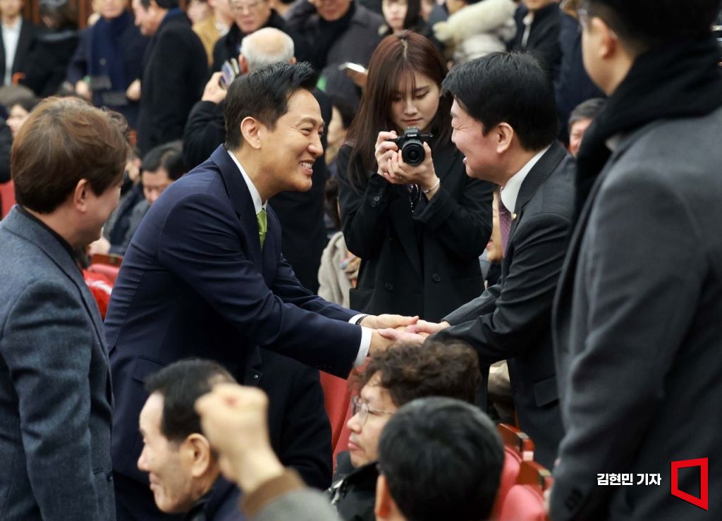 오세훈 서울시장이 12일 국회도서관에서 열린 '87체제 극복을 위한 지방분권 개헌 토론회'에서 참석자들과 인사하고 있다.