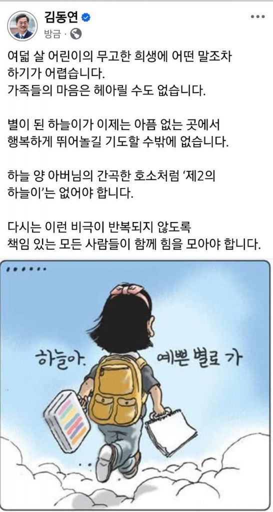 김동연 지사는 12일 자신의 사회관계망서비스(SNS)에 올린 글에서 "여덟 살 어린이의 무고한 희생에 어떤 말조차 하기가 어렵다"며 "가족들의 마음은 헤아릴 수도 없다"고 안타까움을 토로했다.