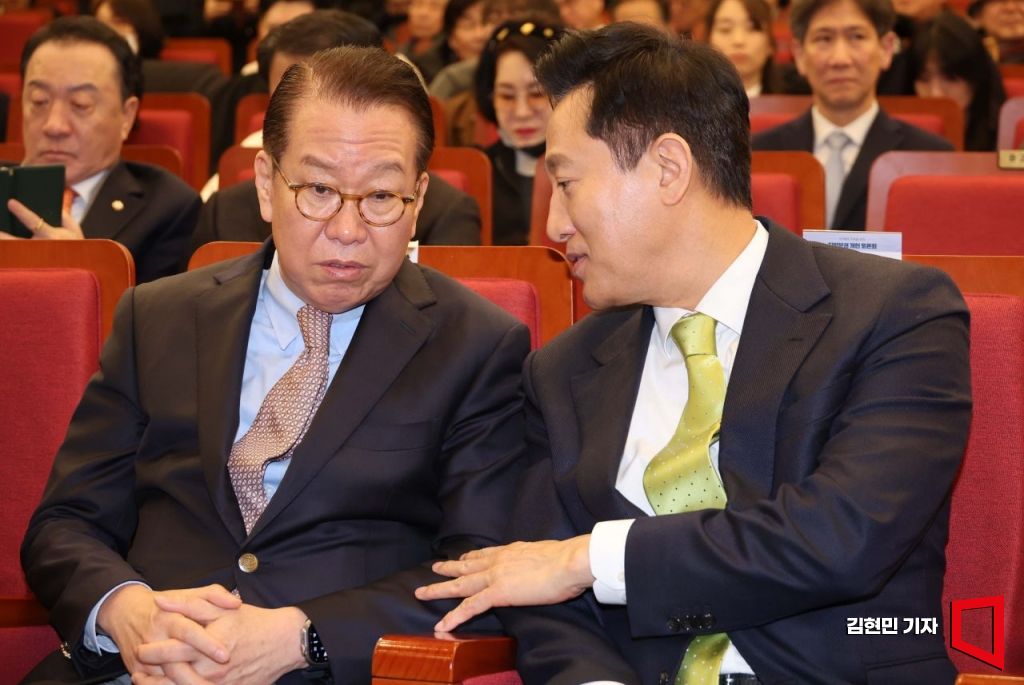오세훈 서울시장과 권영세 국민의힘 비상대책위원장이 12일 국회도서관에서 열린 '87체제 극복을 위한 지방분권 개헌 토론회'에서 대화하고 있다.