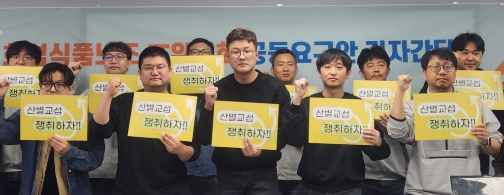 IT·게임업계 노동조합으로 구성된 민주노총 화학섬유식품산업노조 IT위원회 관계자들이 12일 오전 서울 중구 상연재에서 기자간담회를 열고 노사 임금·단체교섭 관련 공동요구안을 발표하고 있다.