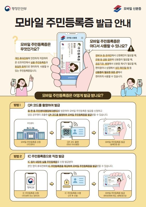 신청 방법은 정보무늬(QR코드)를 통한 발급과 집적회로(IC) 주민등록증 발급 등 두 가지 방식으로 가능하다.