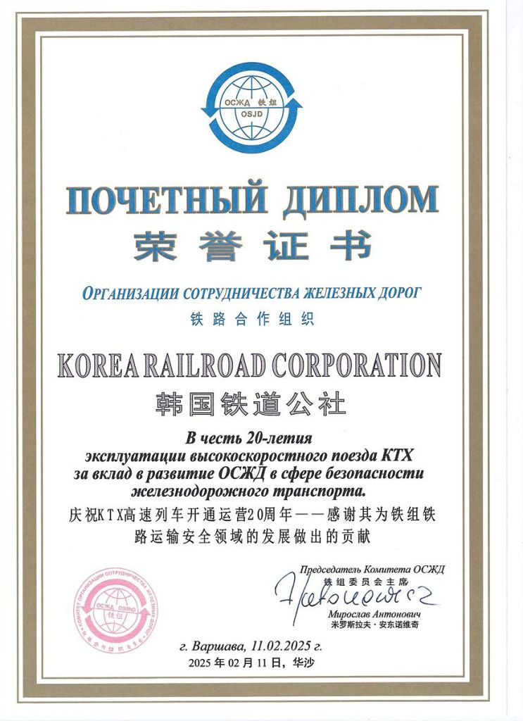 코레일은 OSJD 회원국과 협력해 철도 운영과 안전 기술을 공유한다. 이 과정에서 디지털 기반의 모바일 ‘열차접근 경보 앱’ 등 첨단 안전 기술을 전수, 국제철도 안전기준 강화에 기여한 공로를 인정받아 ‘특별 공로상’을 수상했다.