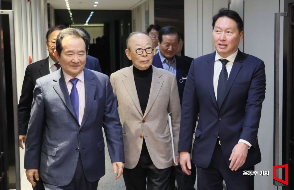 최태원 회장은 12일 서울 중구 대한상의 회관에서 열린 '한국 경제가 나아갈 길, 경제 원로에게 묻다' 간담회에서 "나라의 어른이신 원로들의 경험과 식견이 어느 때보다 절실하고 중요하다"며 "이 자리는 그 지혜를 구하기 위해 마련된 것"이라고 밝혔다. 그러면서 "오늘 참석하신 분들은 과거 여러 차례의 경제 위기를 극복하고 혼란을 수습하는 데 중추적인 역할을 해오신 분들"이라며 "열심히 듣고 공부해서 기업이 실천할 부분은 과감히 시작하겠다"고 덧붙였다.