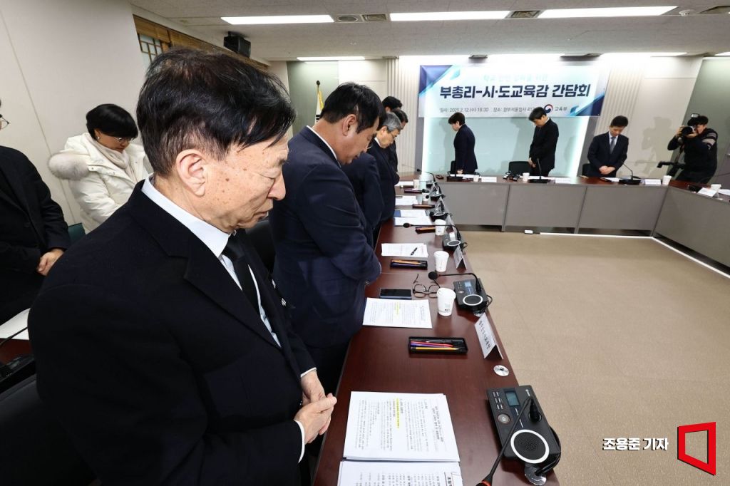 12일 정부서울청사에서 열린 부총리-시·도 교육감 간담회에서 이주호 사회부총리 겸 교육부 장관과 설동호 대전시교육감(왼쪽) 등 교육감들이 지난 10일 대전의 한 초등학교에서 1학년 학생이 교사가 찌른 흉기에 피살된 사건과 관련해 묵념하고 있다.