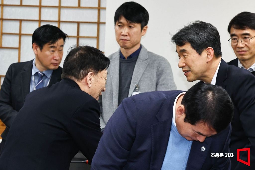 이주호 사회부총리 겸 교육부 장관(오른쪽)이 12일 정부서울청사에서 열린 부총리-시·도 교육감 간담회에 참석하며 설동호 대전시교육감(왼쪽)과 인사하고 있다.