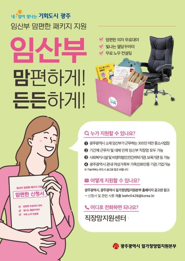 광주시는 지역 중소사업장에 근무하는 임산부들의 근무 환경 개선을 위해 ‘맘편한 패키지 지원사업’을 펼친다고 12일 밝혔다.