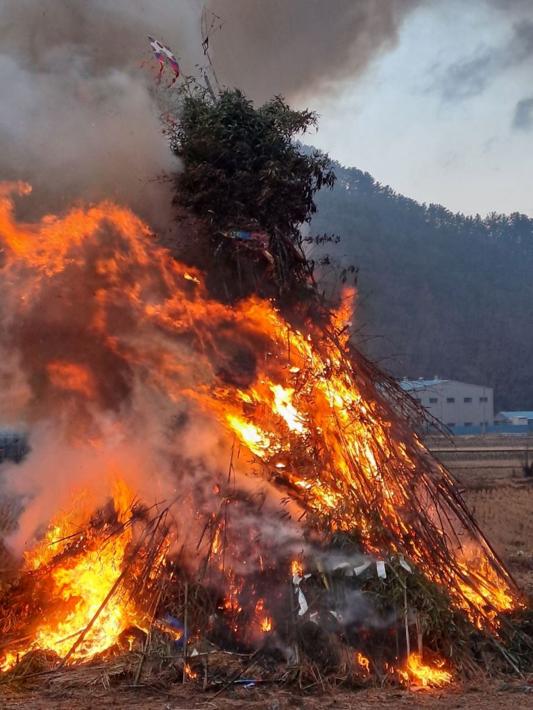 경남 창원특례시 마산합포구 진북면 예곡마을 입구에서 12일 음력 대보름을 맞아 시민 200여명이 참석한 가운데 달집태우기를 했다.